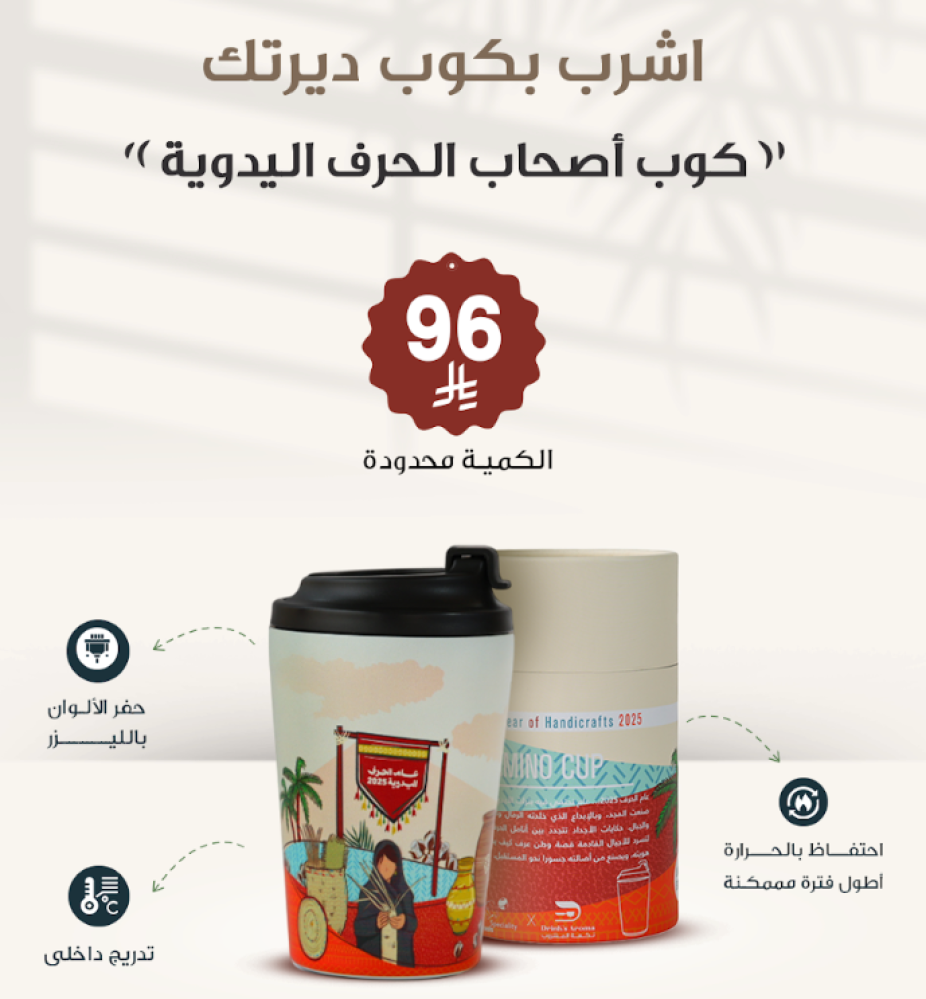 Enjoy your favorite beverage wherever you are with stylish thermal cups bearing the names of the Kingdom's cities, inspired by its most prominent landmarks, adding a distinctive touch to every sip.